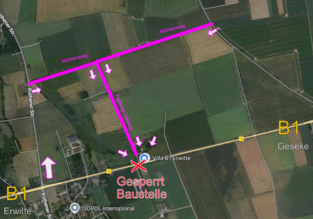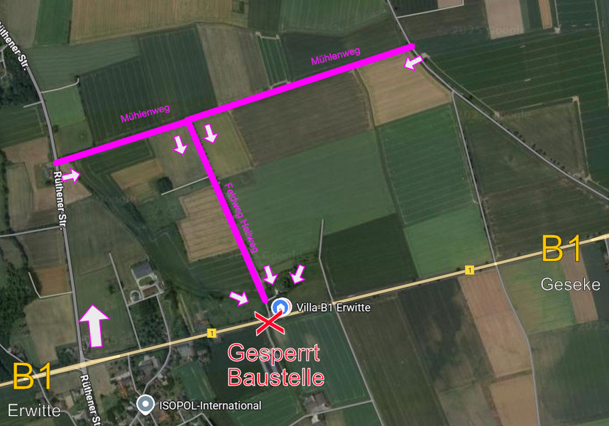 Wenn Ihr aus Geseke kommt, dann Richtung Erwitte Ihr fahrt an dem Villa-Eingang der gesperrt ist vorbei und fahrt dann an der Kreutzung Eikeloh Richtung Lippstadt rechts und dann den nächsten Feldweg rechts rein und dann gerade aus und dann wieder den nächsten Rechts rein.
